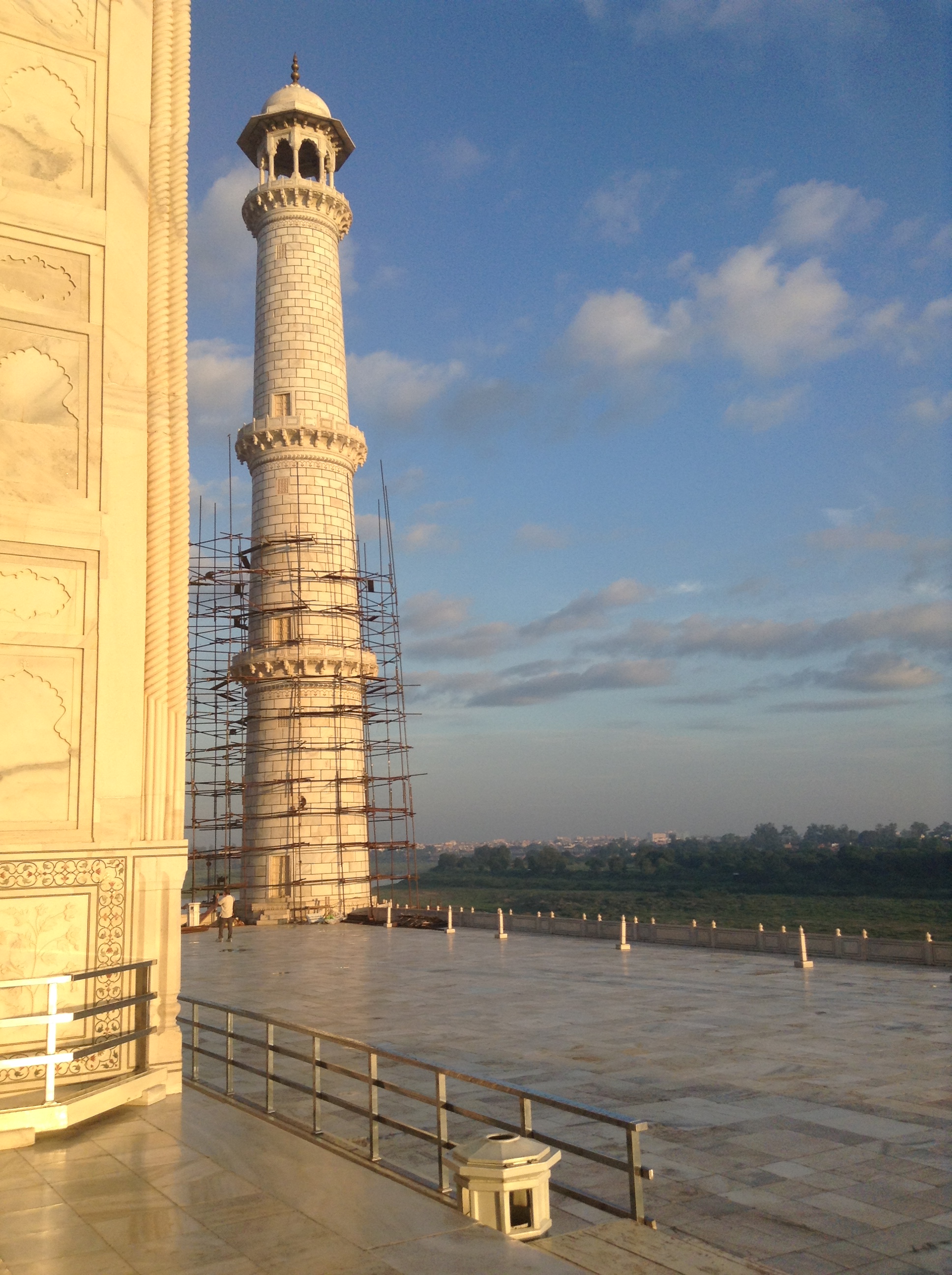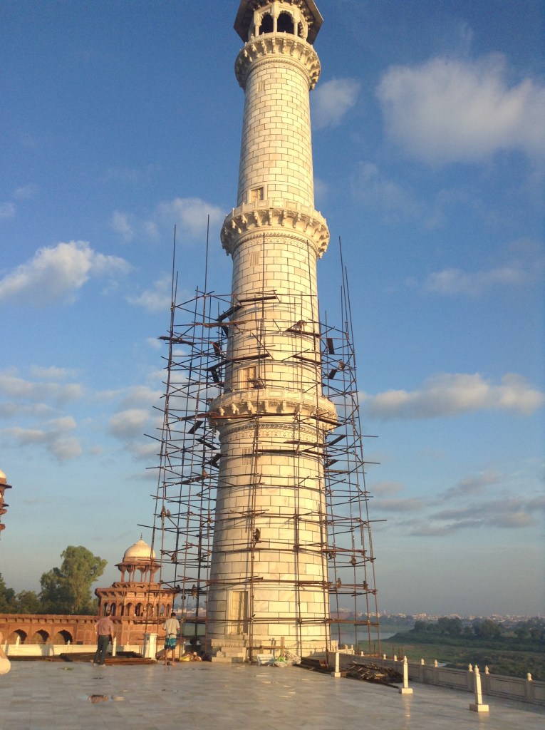 The sky appeared brighter once we’d left the inner space and headed outside to view the sun glinting off the Yamuna River while monkeys chattered away high up in the scaffolding of one of the minarets.